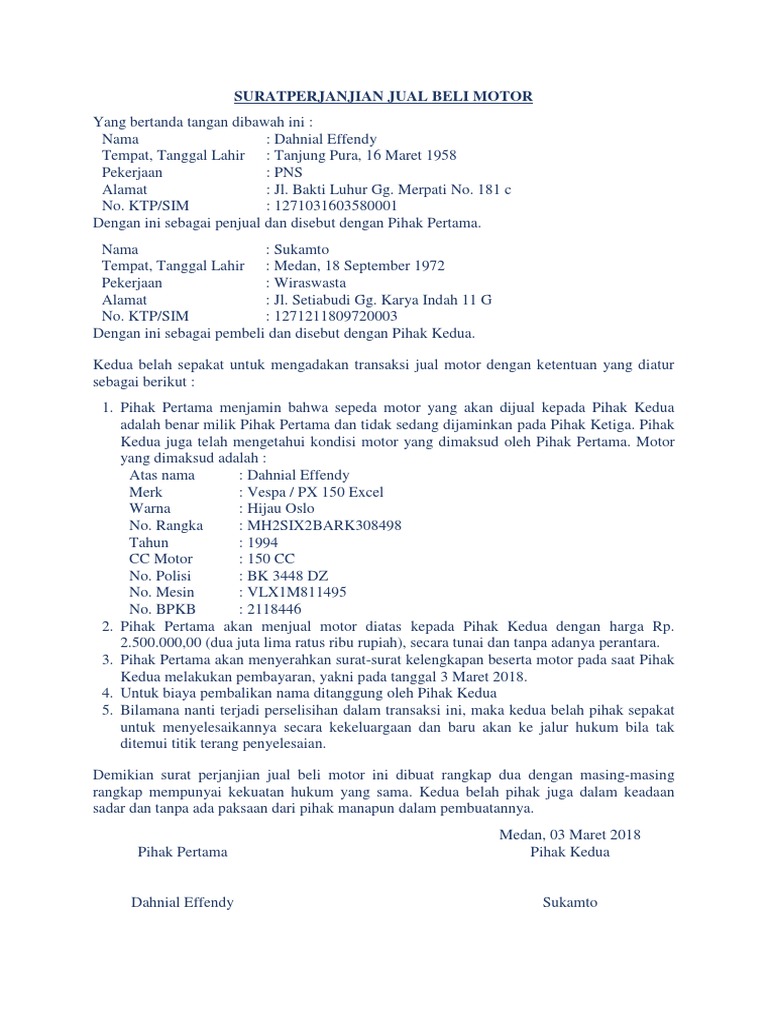 Pihak pertama (penjual) menyerahkan motor, bpkp, dan stnk kepada pihak kedua (pembeli). Surat perjanjian jual beli tanah ini, dibuat oleh pihak penjual dan pembeli untuk menjelaskan hak serta kewajiban yang tidak boleh dilanggar oleh kedua belah pihak. Pada har ini tanggal 24, bulan juni, tahun 2016. Minat tlpn /wa 081216780011 terima kasih. Pasal 1 jenis barang 1. Surat perjanjian jualbeli sepeda motor by operator warnet v. Surat perjanjian jual beli merupakan surat yang dibuat oleh penjual dan pembeli untuk menerangkan atau menjelaskan hak dan kewajiban kedua belah pihak ( ) tersebut di atas merupakan contoh surat perjanjuan jual beli motor, pembahasan selanjutnya adalah contoh surat perjanjian jual beli mobil. Contoh kwitansi jual beli motor. Surat jual beli motor termasuk ke dalam surat yang resmi dimana ketika membuat surat ini harus menggunakan bahasa yang formal. Surat perjanjian jual beli motor. Business service in surabaya, indonesia. 26,879 likes · 43 talking about this · 150 were here. Surat perjanjian jual beli motor adalah surat yang dibuat sebagai bukti hitam di atas putih antar kedua belah pihak yang terlibat sehingga bisa dipertanggung jawabkan dikemudian hari jika terjadi suatu hal yang tidak di inginkan.