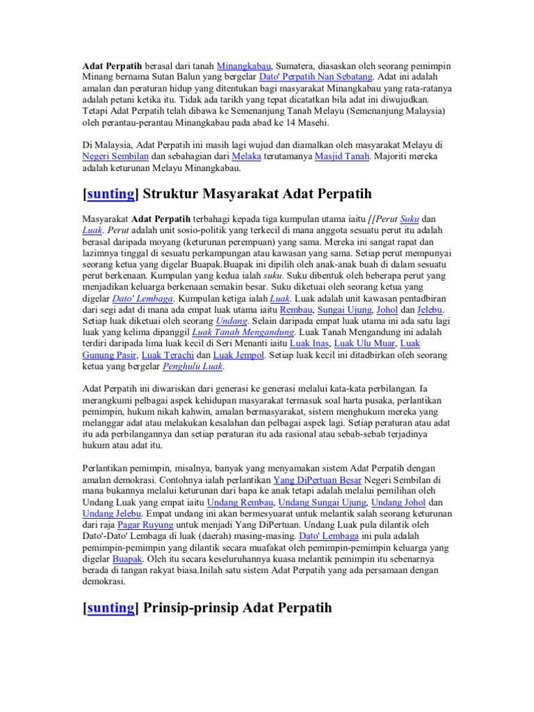 Over time, this custom is practiced by many other ethnics including part of malacca in particular of masjid tanah and part of johor. Luak dalam perundangan adat perpatih seseorang itu tidak boleh dikatakan bersalah selagi mana dia. Adat perpatih (عادت ڤرڤاتيه) berasal dari tanah minangkabau, sumatera, diasaskan oleh seorang pemimpin minang bernama sutan balun yang bergelar dato' perpatih nan sebatang. • pada peringkat awal penyebarannnya di tanah melayu,adat 16. Adat ini berasal dari utara sumatera dan dikembangkan oleh dua beradik iaitu datuk ketemenggungan yang kemudiannya berkuasa di palembang (adat temenggung) dan datuk…