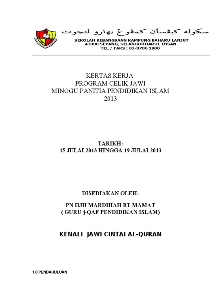 Kem cemerlang jawi 2015 ( anjuran panitia agama islam ) sekolah kebangsaan beluru 1. Kertas kerja kem cemerlang jawi skm syurga impianku tempatdewan dan kelas sk matang objektifkem cemerlang jawi ini diadakan bertujuan untuk memastikan murid dapat i. Gpi boleh memilih dan mendownload fail disini mengikut kesesuaian dan kebijaksanaan gpi.dalam menguruskan kcj di peringkat sekolah. Laporan mtq zon jorak 2018 syahidah shabuddin. Kem cemerlang jawi ini diadakan bertujuan untuk memastikan murid dapat. Justeru langkah program jqaf melaksanakan kem cemerlang jawi bermula tahun 2015 akan. Kem bestari solat (kbs) 1. Kertas kerja pengelolaan kem sukan sekolah. Kertas kerja kem bestari solat 2019 syahidah shabuddin. Data plc (spl kpm) 2. Instrumen pemantauan pelaksanaan klik di sini 7. Soalan pt3 kemahiran hidup, soalan kbat kemahiran hidup, soalan pt3 kemahiran hidup pdf, soalan kimia tingkatan 4, soalan kimia mid year tingkatan 4, soalan komsas ku ingin berterima kasih, soalan kelakar, soalan kerjaya, soalan kefahaman, soalan ketaksamaan linear, soalan kefahaman untuk pemulihan, soalan kepimpinan. View kertas kerja kem cemerlang jawi.doc from bahasa dan lingguistik 123 at kolej islam sultan alam shah.